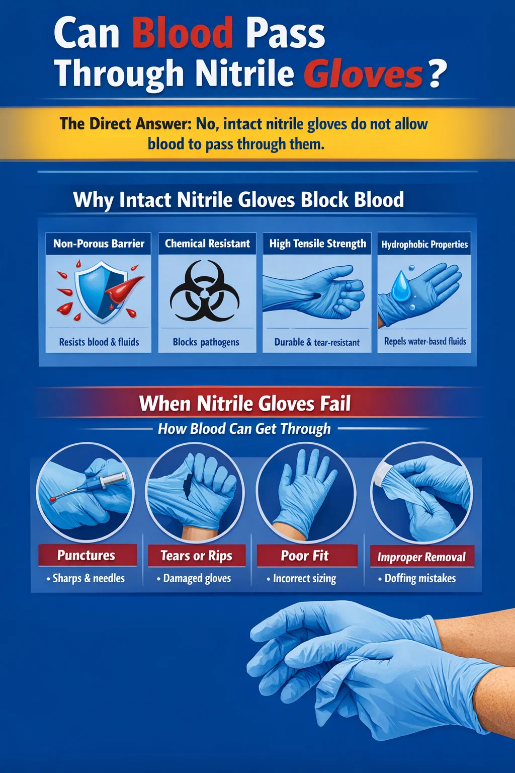 Under normala förhållanden, intakta nitrilhandskar tillåter inte blod att passera genom dem. Nitrilgummi är ett tätt, syntetiskt material som bildar en kontinuerlig barriär mot vätskor, inklusive blod och andra kroppsvätskor. Detta är en av de främsta anledningarna till att nitrilhandskar har blivit det dominerande valet i medicinska, laboratorie- och nödsituationer världen över.