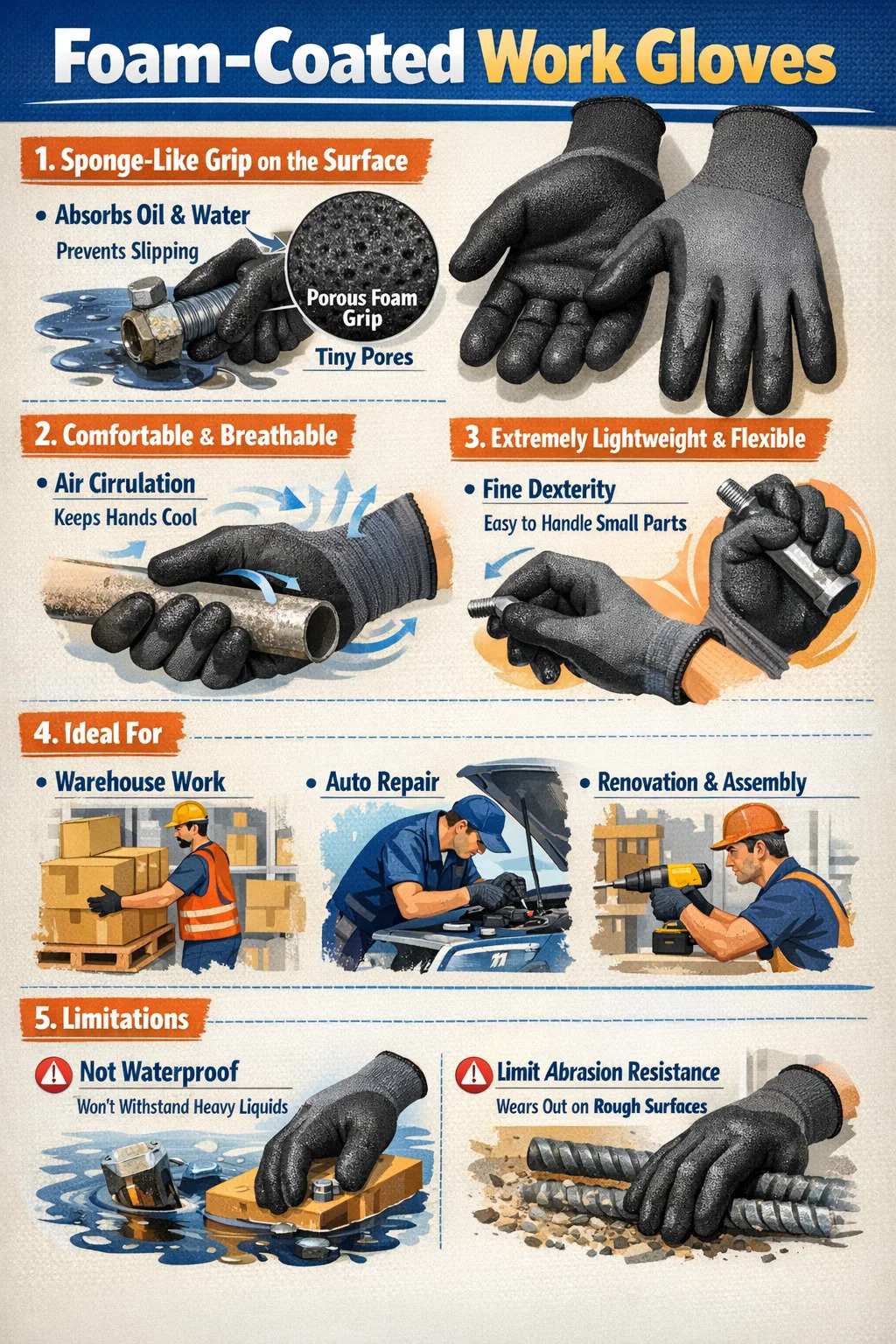 Luftcirkulation: Eftersom beläggningen är "skummad" kan luft cirkulera genom de små porerna. Jämfört med helt slutna plast- eller tjocka gummihandskar är skumhandskar svalare och förhindrar att händerna blir klibbiga.