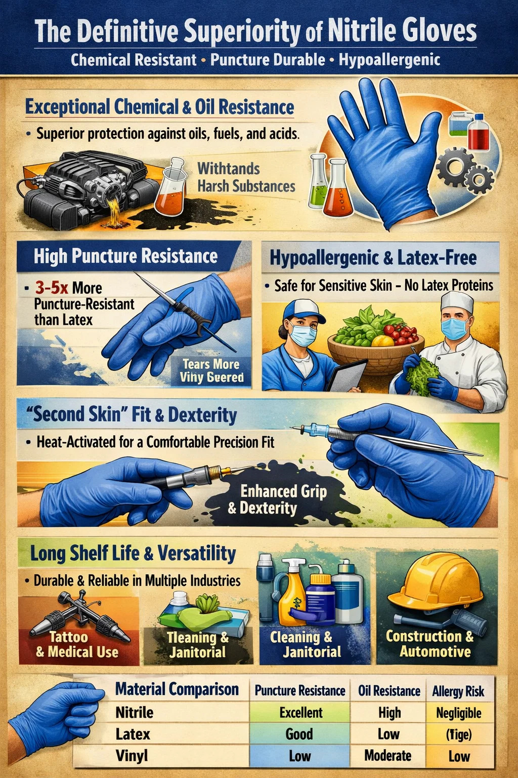 I den tatueringsindustrin , är svart nitril att föredra eftersom det döljer bläckfläckar och motstår petroleumgelé som används under processen. In vaktmästeriarbete , de skyddar mot blekmedel och ammoniakbaserade rengöringsmedel som lätt skulle tränga igenom billigare vinylhandskar. Denna mångsidighet bevisar att nitril inte bara är ytterligare ett engångsalternativ – det är ett specialiserat verktyg för säkerhet.