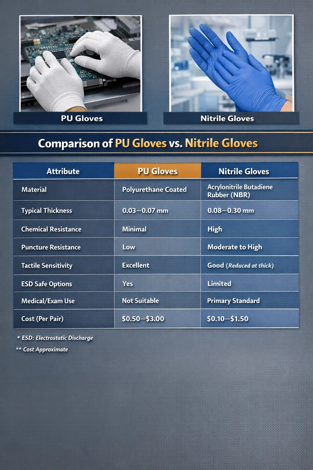 PU (polyuretan) handskar och nitril handskar är inte utbytbara. PU-handskar är tunna, lätta och designade främst för renrumsmiljöer och elektronikhantering, medan nitrilhandskar erbjuder robust kemikaliebeständighet och punkteringsskydd lämpliga för medicinsk, laboratorie- och industriell användning. Att välja fel typ minskar inte bara effektiviteten – det kan utsätta arbetare för verkliga faror eller förorena känsliga komponenter.