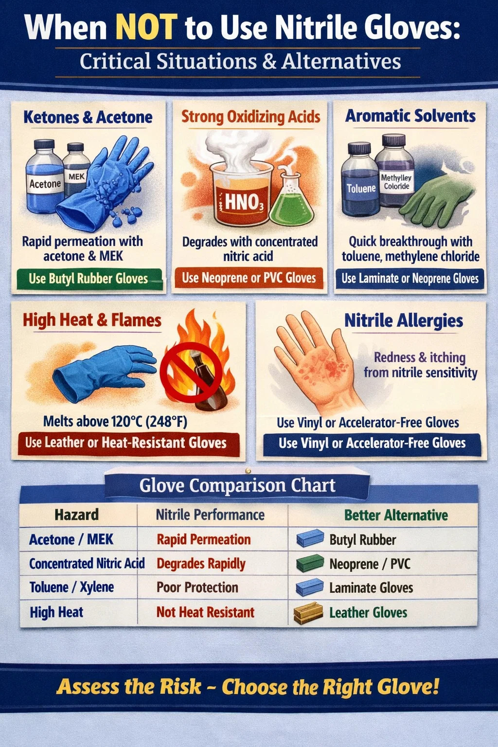 Det korta svaret: undvik nitrilhandskar när du hanterar vissa ketoner, starka oxiderande syror eller högkoncentrerade lösningsmedel; när du arbetar med extrem värme eller öppna lågor; när fin taktil fingerfärdighet är kritisk och uppgiftens varaktighet är kort; eller när personen som bär dem har en dokumenterad nitrilkänslighet. Läs vidare för hela uppdelningen.